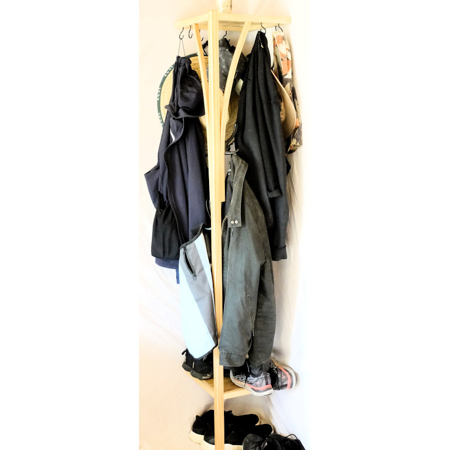 The Gravity Coat Stand is ideal for a lost corner in the home. Defying gravity, with one “leg” and no base, the Gravity Stand uses the weight of itself and the jackets to lean against the wall. A single screw holds it in place. With room for hats, coats and everything else, it also has two shelves: one at the top for keys etc, and a bottom shelf for shoes. 1830 (h) x 350 x 350 mm. Made of pine.
