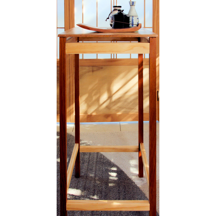 A light-weight decorative stand for something special. 740 (H) x 350 x 350mm. Made of a mixture of light & dark woods with a veneered-ply top.
